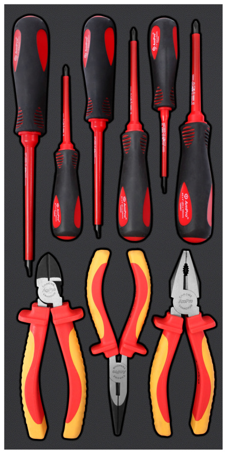 Приобрести T28474 Набор отверток диэлектрических, губцевый инструмент (VDE-1000V) 9пр. в мягком ложементе от компании AmPro (Тайвань) из раздела Ложементы мягкие (VA серия) по цене 7 654 рублей.