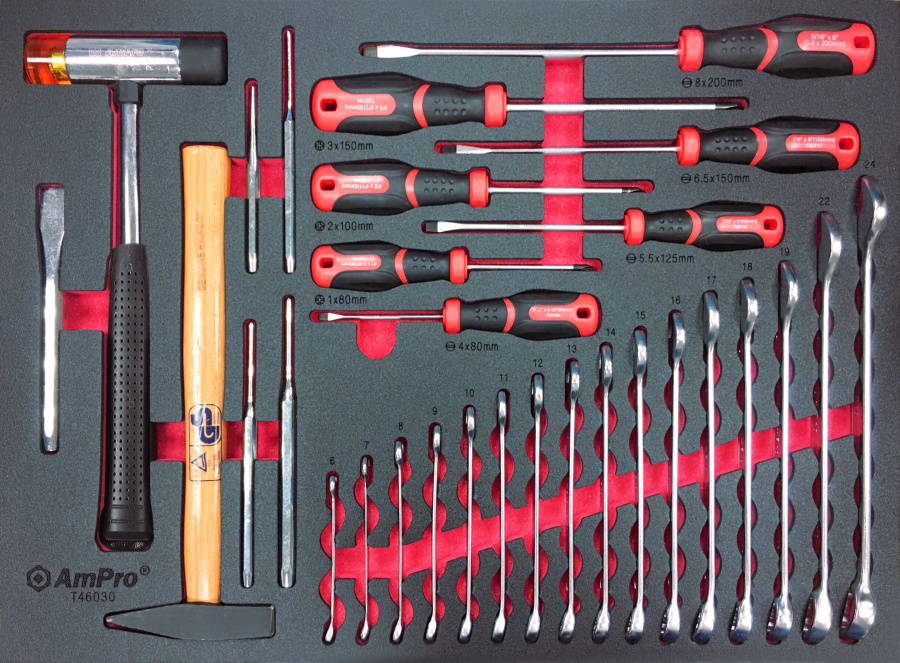 Приобрести T46030 Набор комбинированных ключей,отверток и ударного инструмента, 30пр. в мягком ложементе от компании AmPro (Тайвань) из раздела Ложементы мягкие (VA серия)
