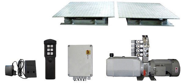 Гидравлические приводы подвижных площадок, радиопульт управления с осветительной лампой.